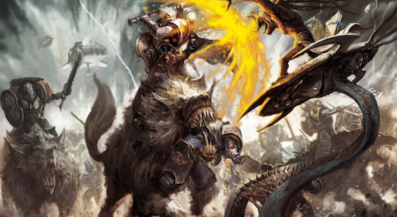 Having seen Danny’s list in action and watching him go to the top table at a local 30+ person tournament only to lose to a mirror match with Wolftide, I decided to give Wolftide a try. Danny is out of 40k commission for a while so I asked to give his 50 wolves a stroll across the battlefields of the 41st millenium. I knew from watching him play the list I didn’t want to cut and paste it. I didn’t like Azrael and the Grey Knights. I wanted to be a Space Wolves player, not just have a single formation of Space Wolves. I decided to go back to Thunderstar, something I hadn’t played since 5th edition when my Thunderwolves were made from Chaos Knights because there were no Thunderwolf Cavalry models aside from Canis. I like lists with more than a single threat (Drop Pod Battle Company, Blackmanes) because those have a lot of moving pieces and a lot of threats over a single large one.