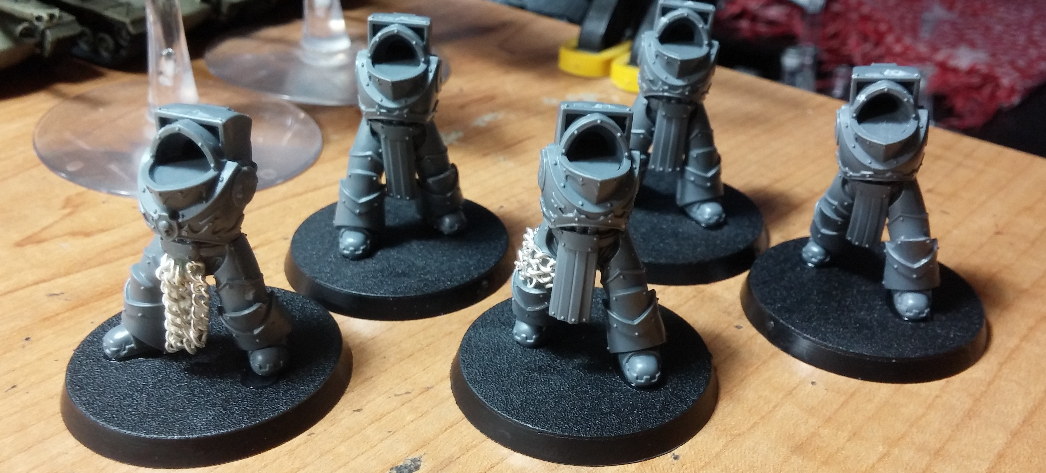 I want these models to be a bridge, visually, between the heresy-era Grave Wardens and the full-tilt spike factory 40k models. With that in mind, I’m looking at things like hanging chains, some wear-and-tear on the armor, some of the ‘sink-drain’ details / exhaust vents, spikes, and hopefully some different heads than the pancake helmets the Cataphractii usually wear.