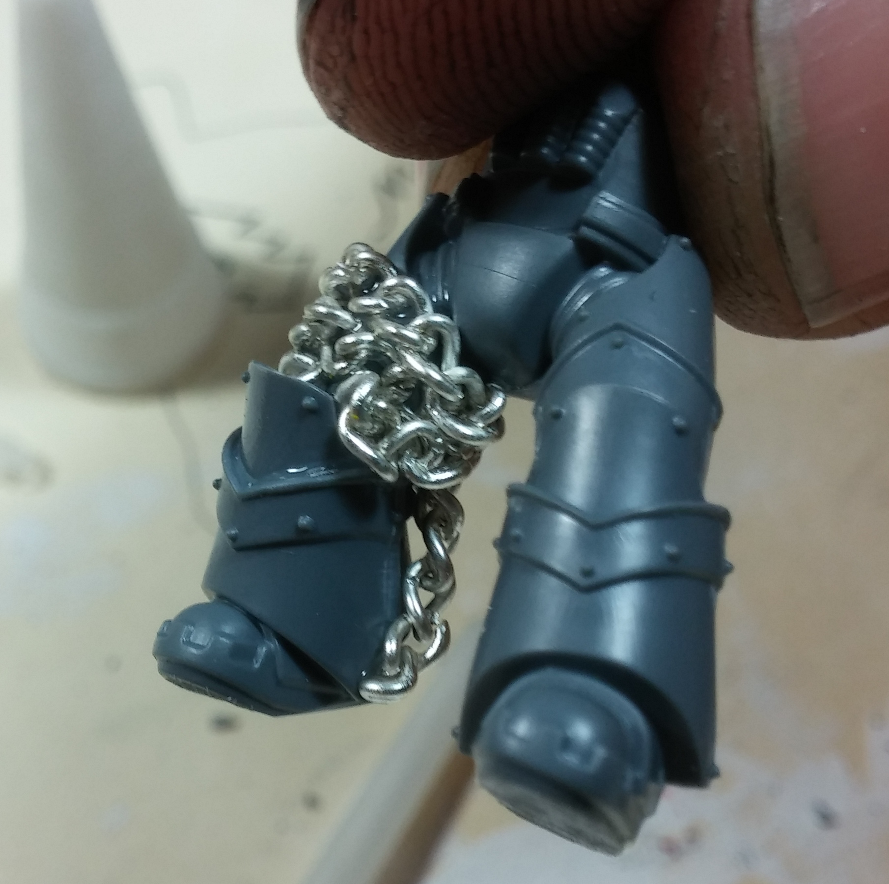 Once wrapped, there were again some bald spots where the wrapping starts and ends, so I added a dangling piece on the back of the leg and used a couple of the clipped links to fill in holes so the chain looks nice and solid wrapped around there. Again, a couple tiny dabs of glue to immobilize the chain and a little drying time, then back to plastic glue for the actual leg assembly.